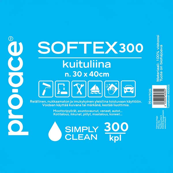 100% viskoosista valmistettu Softex on markkinoiden imukykyisin kuituliina. Se kestää hyvin kaikkea likaa, kuten kemikaaleja ja nesteitä ja pystyy sitomaan 2000% kosteutta omaan painoonsa nähden.